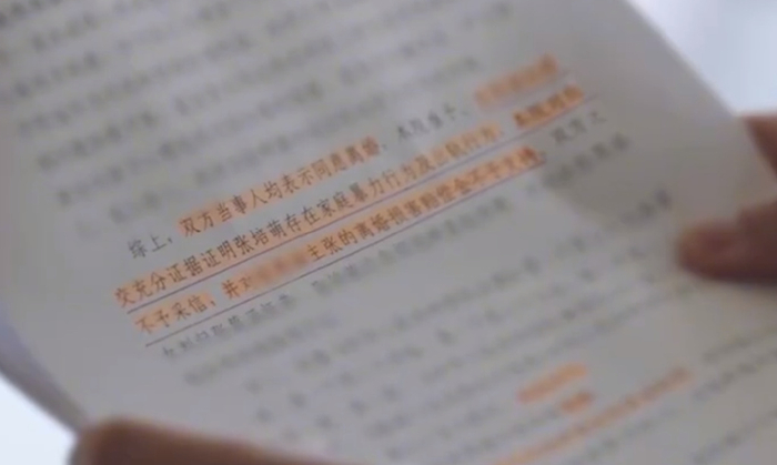面对镜头,张培萌展示了法院在2023年3月下达的判决书,上面显示:张培萌前妻“未提交充分证据证明张培萌存在家庭暴力行为及出轨行为,本院对此不予采信,并对张XX主张的离婚损害赔偿金不予支持。”