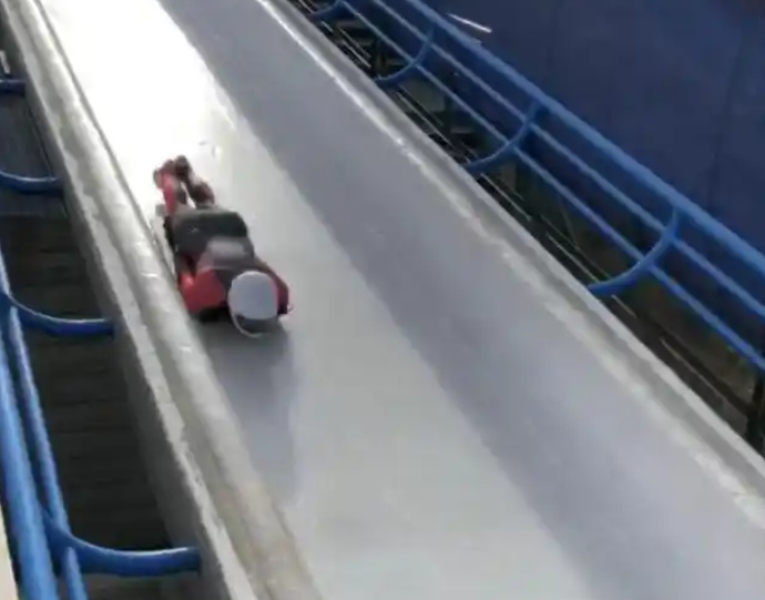 “我妈反复叮嘱我‘注意安全,别只知加速’,我特想告诉她,这玩意儿没个刹车没个油门的,我想注意也控制不了。加速就别提了,所以趴下准备的时候我紧张到头盔内氧气不足。”